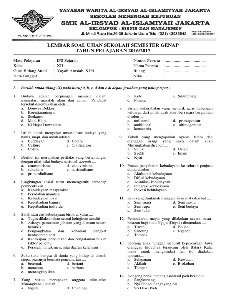 Soal Kewirausahaan Kelas 12 KLIK DISINI Demikianlah Bank Soal SMA SMK Kurikulum 2013 Kelas 10 11 12 yang bisa kami bagikan semoga apa yang kami berikan bermanfaat untuk bapakibu guru semua. Contoh latihan soal ulangan UASUKK Pendidikan Agama Islam PAI SD Kelas 4 terbaru pada semester genap akhir tahun ajaran 20172018. SOAL UTS Pelajaran IPS Kelas 5 SD Semester 2 Kurikulum 2013 dan Kunci Jawaban.