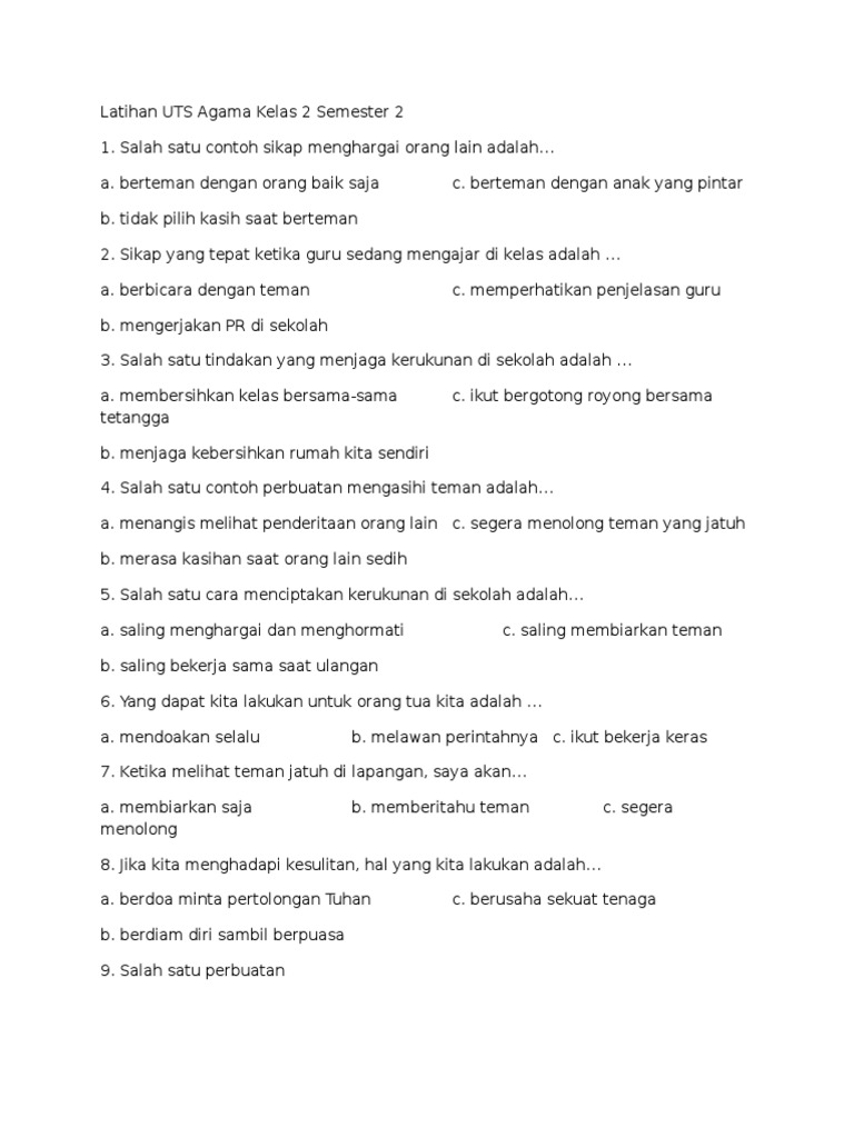 Latihan Uts Agama Kristen Kelas 2 Semester 2